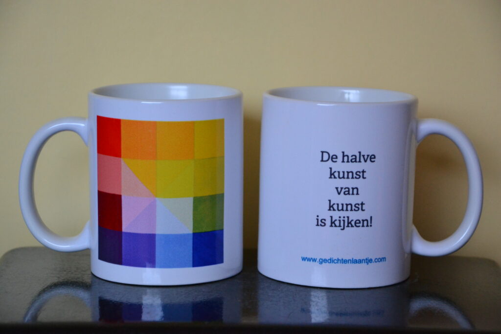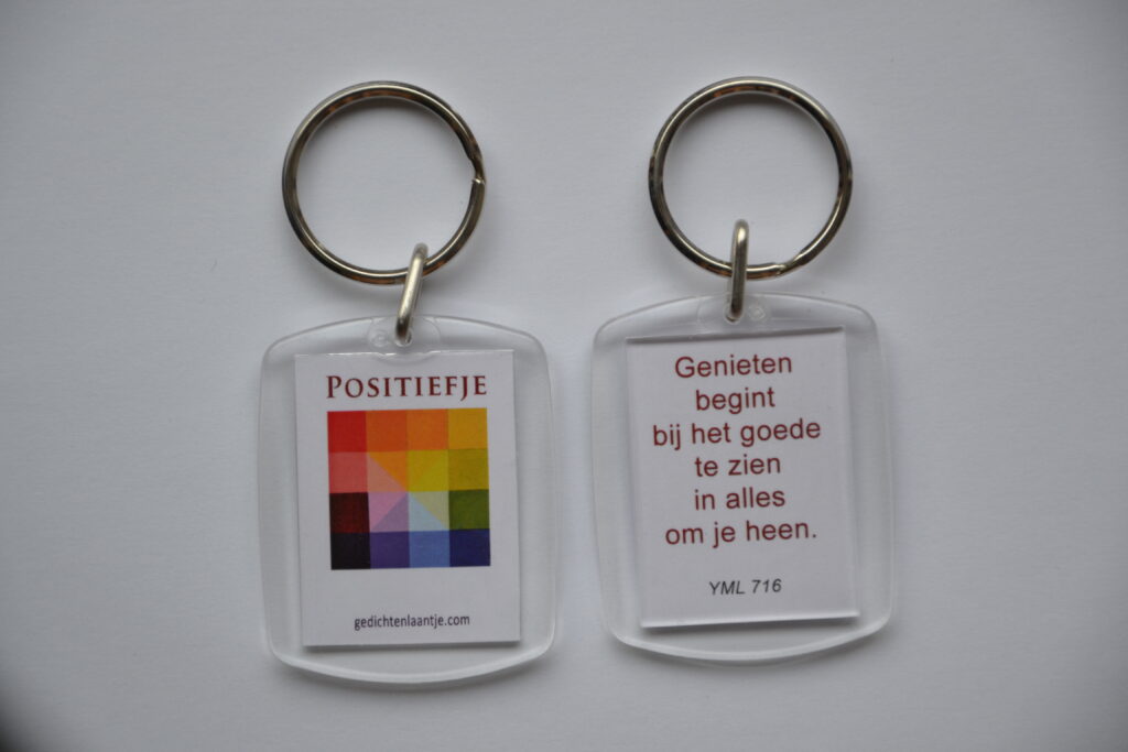 Sleutelhangers en bedrukte drinkbekers met poëzie, spreuken en kunst van Yvonne van der Laan.
