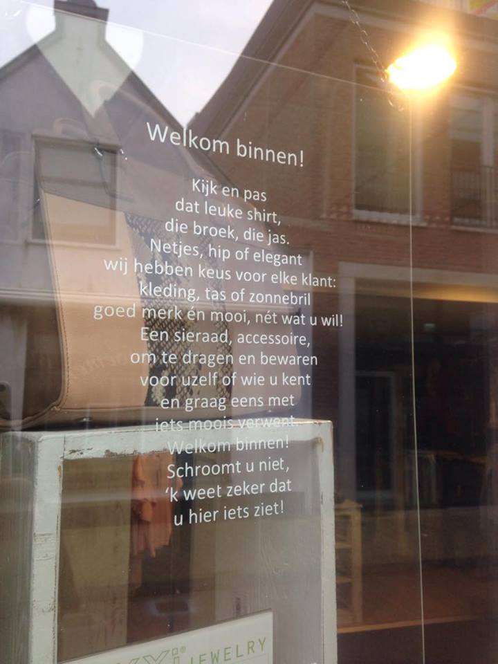 Etalagepoëzie ‘Welkom bij de kapper’ en ‘Welkom binnen’.