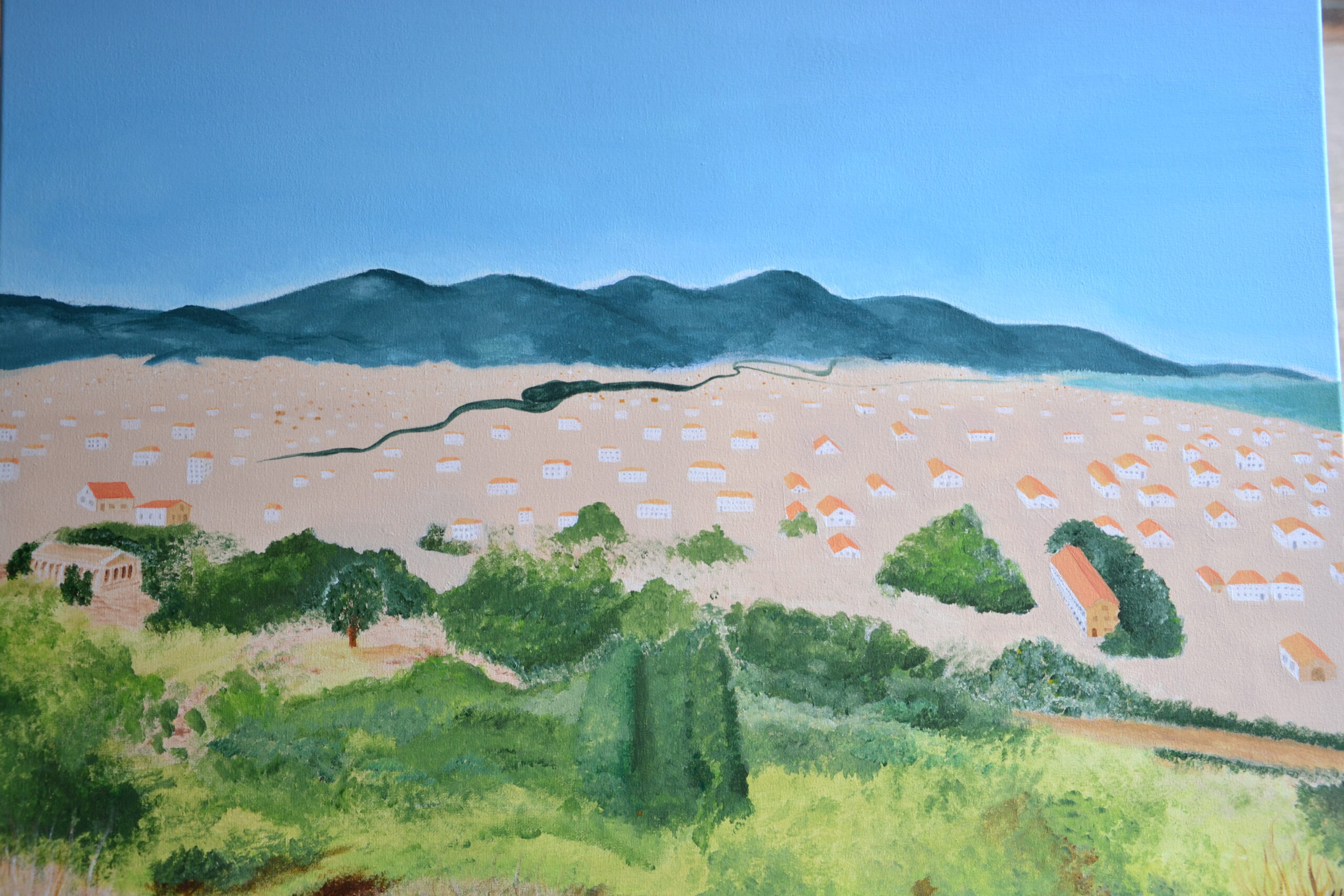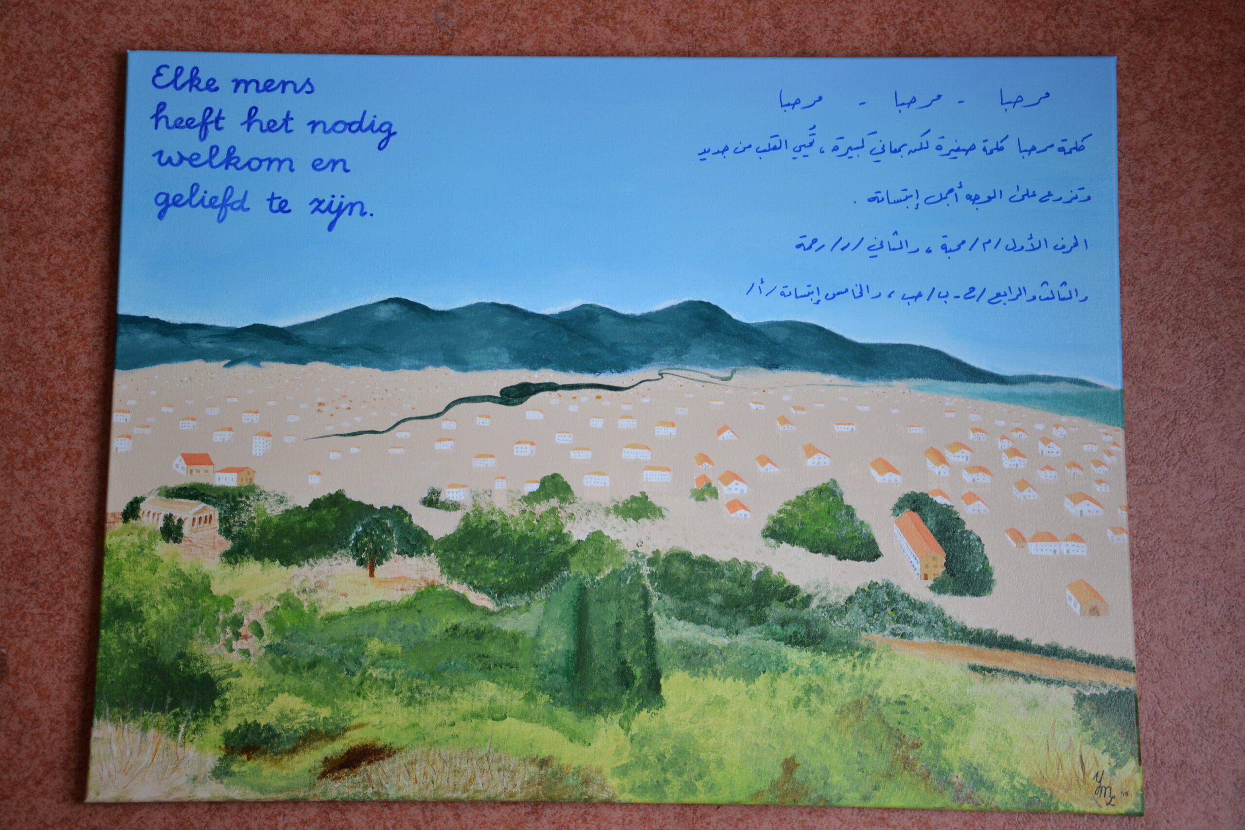 Dit schilderij is geschonken aan de gemeente Neder-Betuwe en de vrijwilligers die geholpen hebben bij de opvang van de Syrische vluchtelingen in de sporthal in Dodewaard, november 2017.