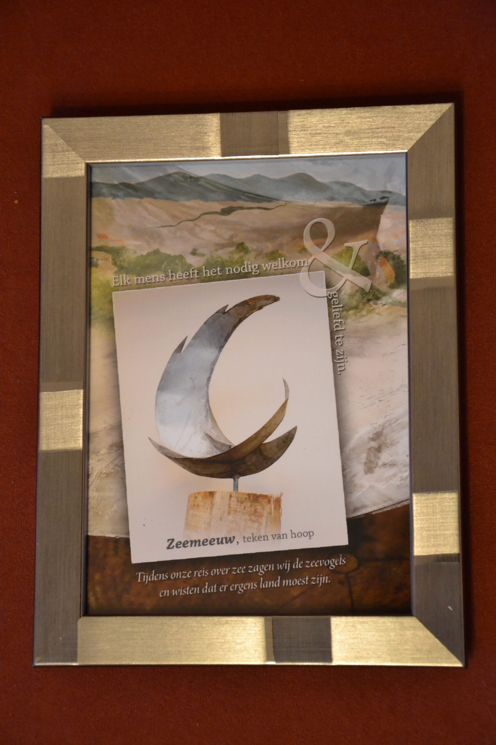 Acrylschilderij, in november 2015 door kunstenares Yvonne van der Laan gemaakt namens de Syrische vluchtelingen die in de sporthal in Dodewaard verbleven, als geschenk voor de gemeente/vrijwilligers (de vrijwilligers kregen een ingelijste kleine print van dit schilderij met de metalen ‘Zeemeeuw’ die gemaakt was door een kunstenaarsechtpaar in de Syrische vluchtelingengroep. Zie foto.).