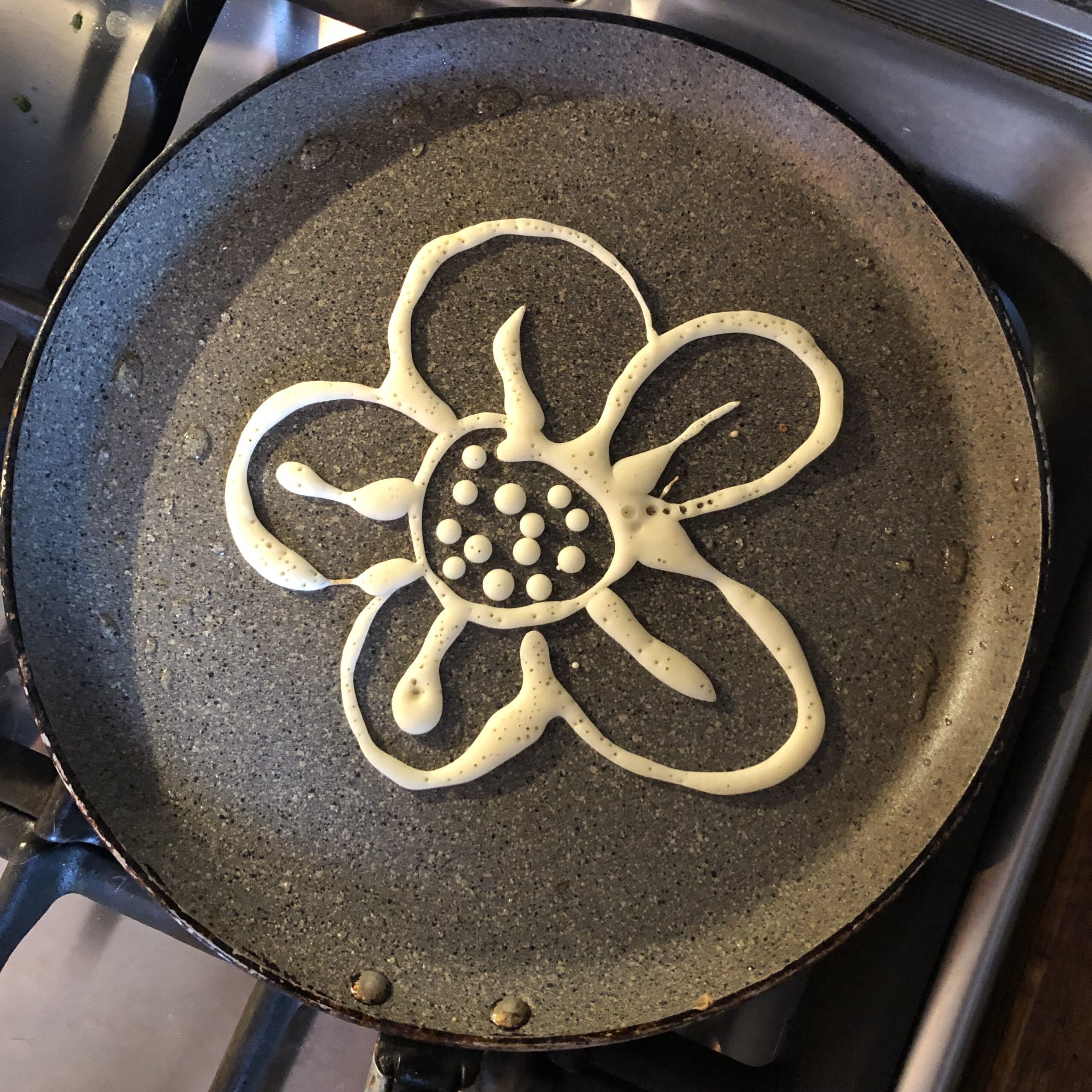Tip voor creatieve pannenkoeken: voeg als eerste het beslag toe op de plaatsen die het donkerst moeten worden in jouw ontwerp. In dit geval: de buitenlijnen van het hartje van de bloem en van de blaadjes. De stipjes in het hartje van de bloem en de streepjes in de blaadjes. Gebruik hiervoor een klein spuitje en vul die tussendoor bij.