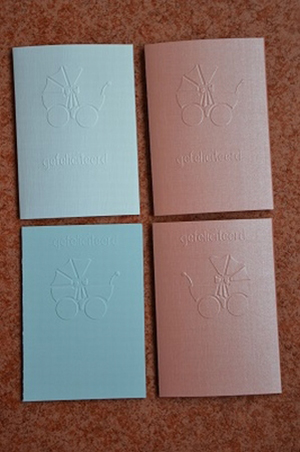 In wit, lichtblauw of roze uitvoering. Met reliëf “Gefeliciteerd” of “Veel geluk”. Binnenin blanco.