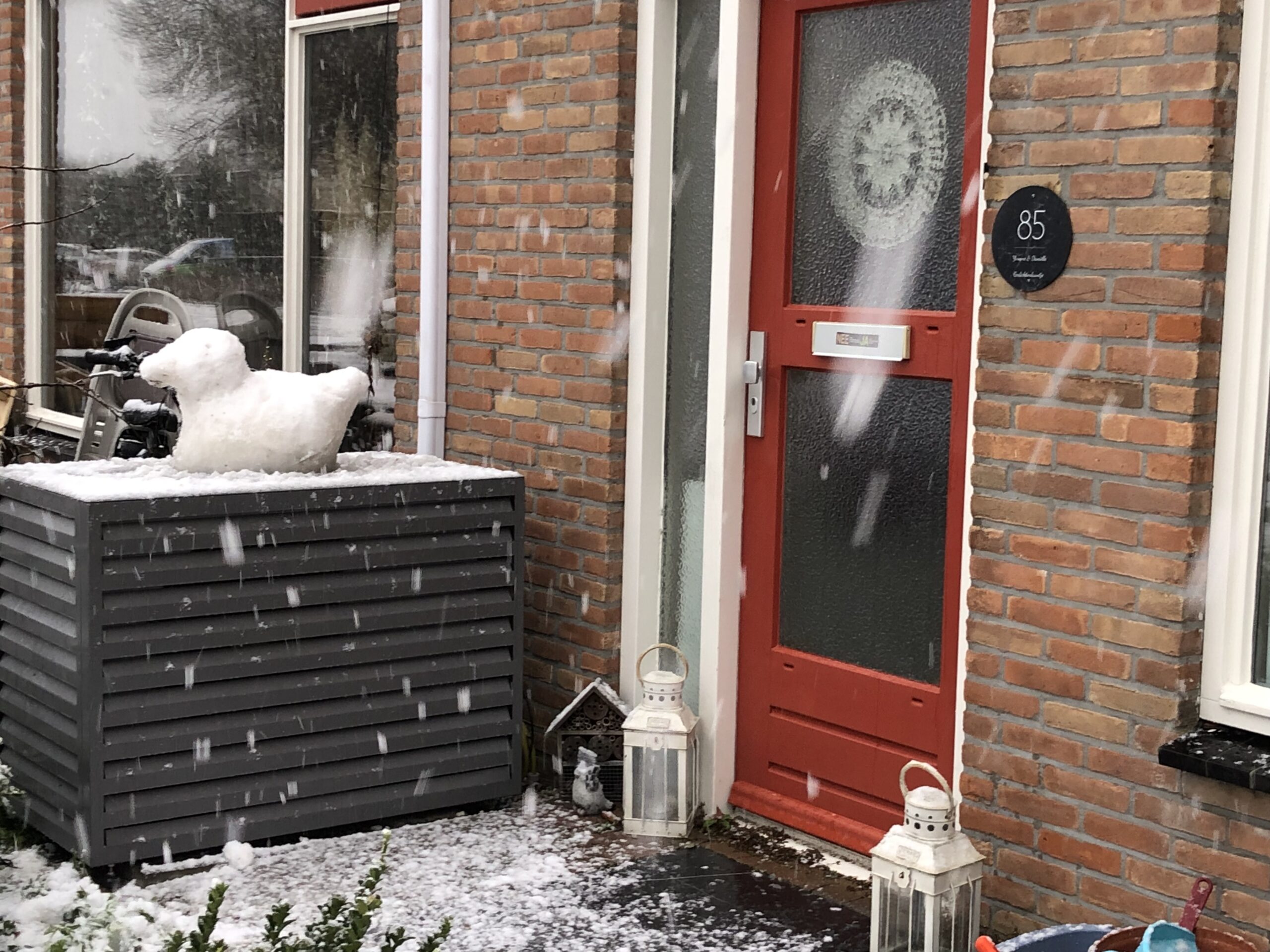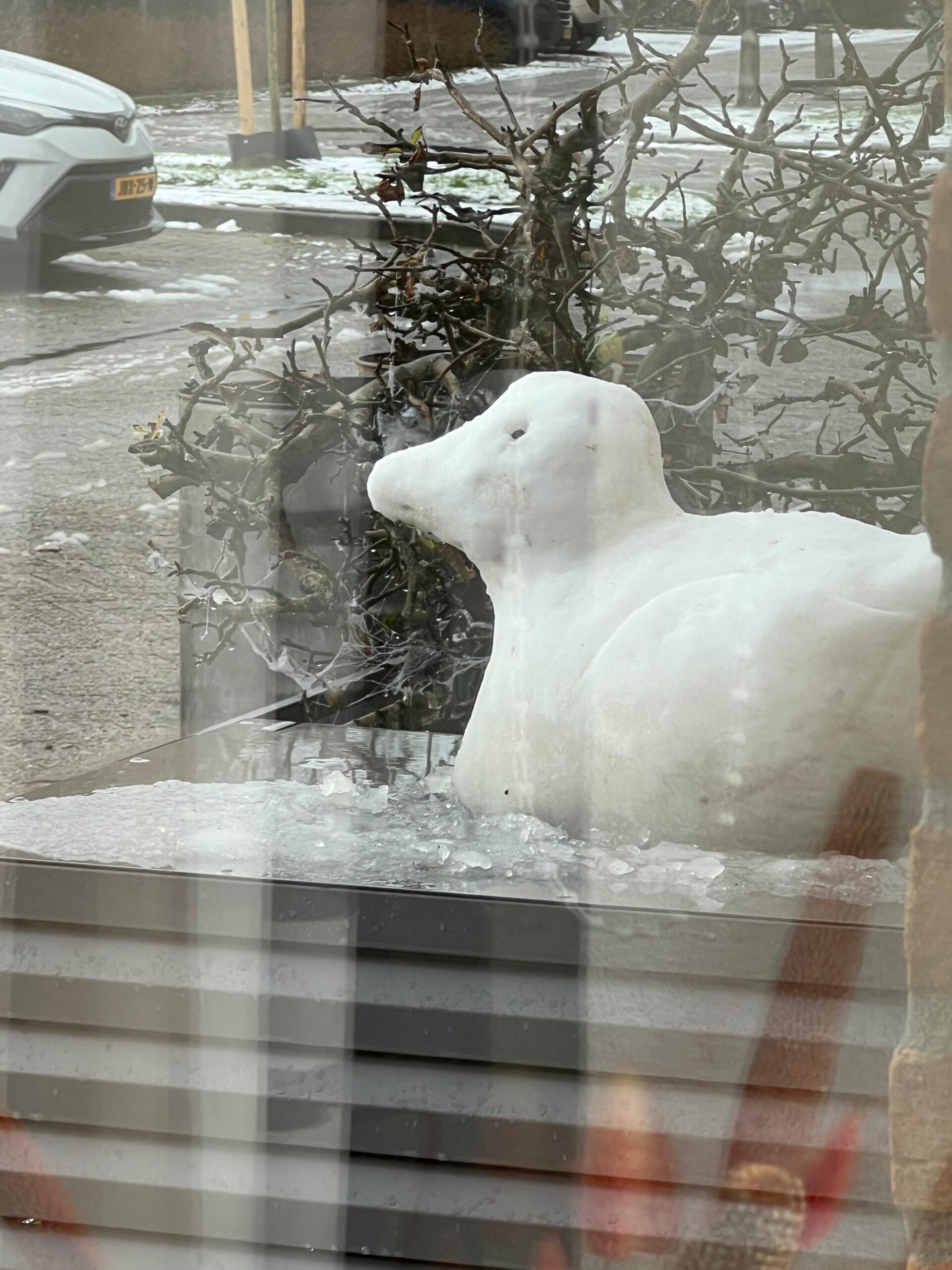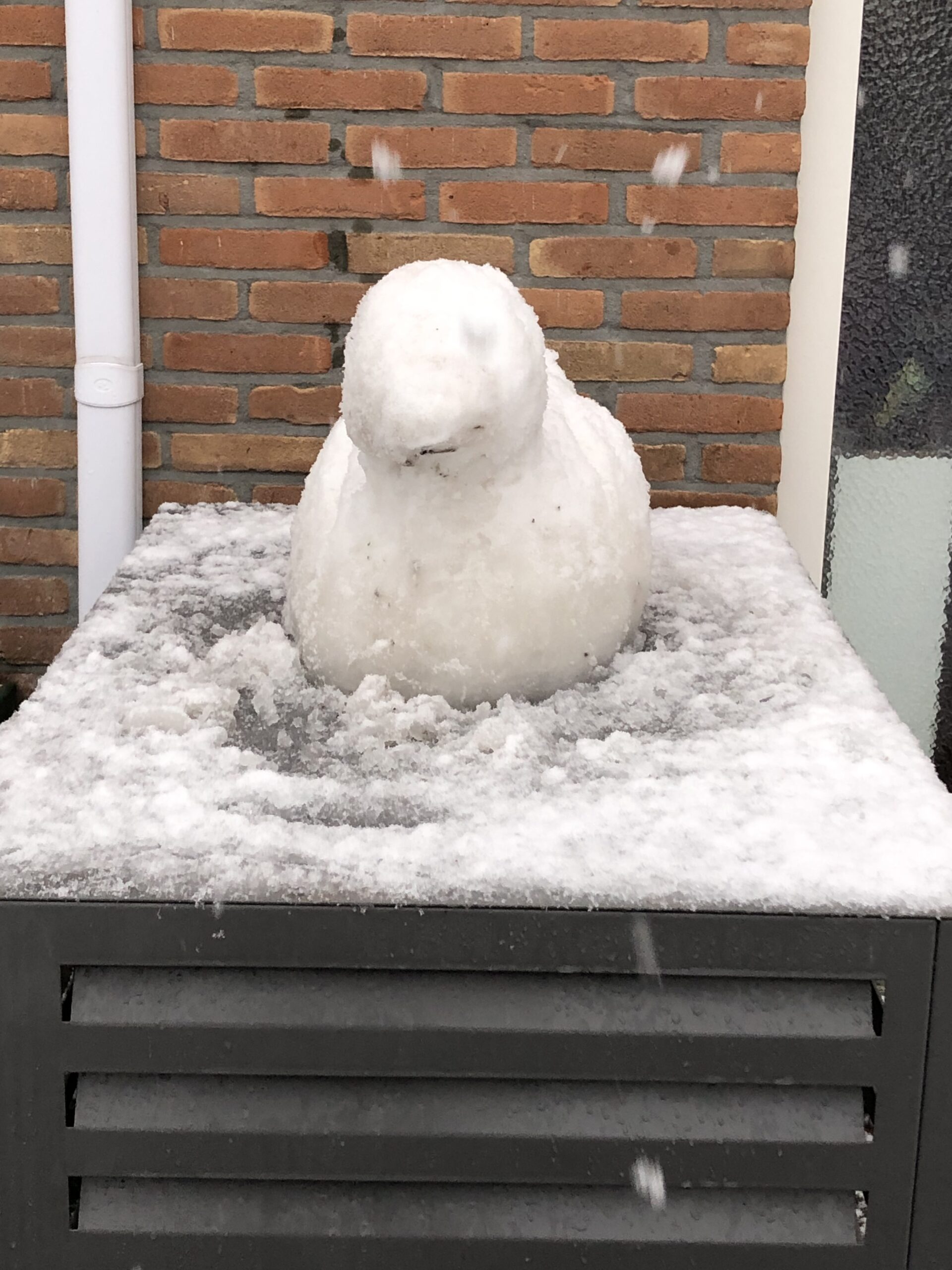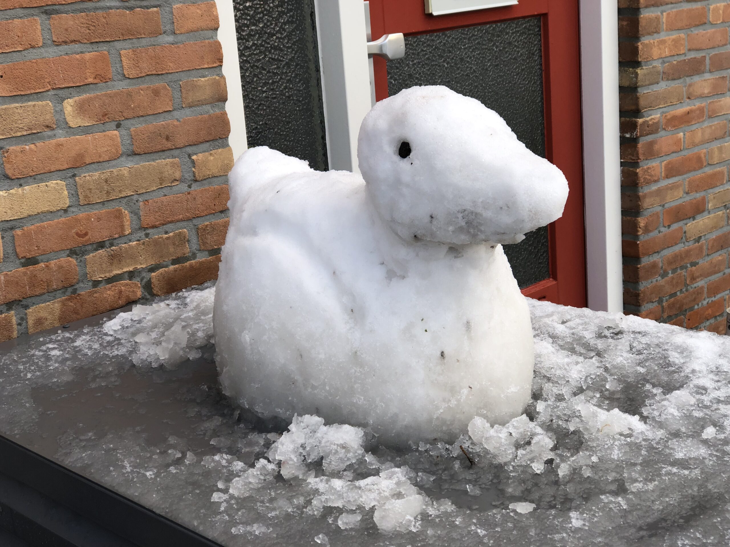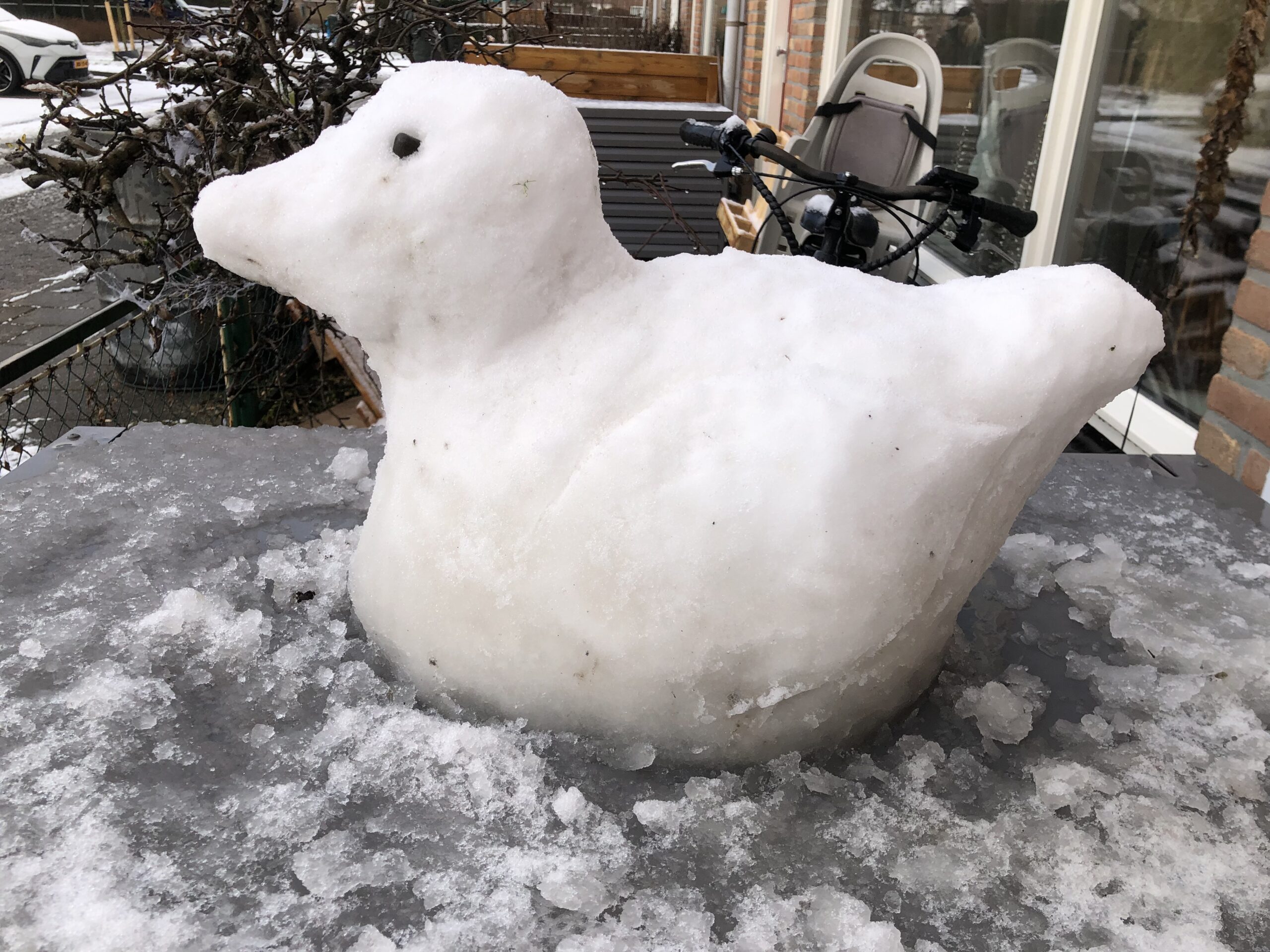 Sneeuwsculptuur Eend. Op 02-01-2026 gemaakt door kunstenares Yvonne van der Laan, in haar voortuin, geïnspireerd door een badeentje.