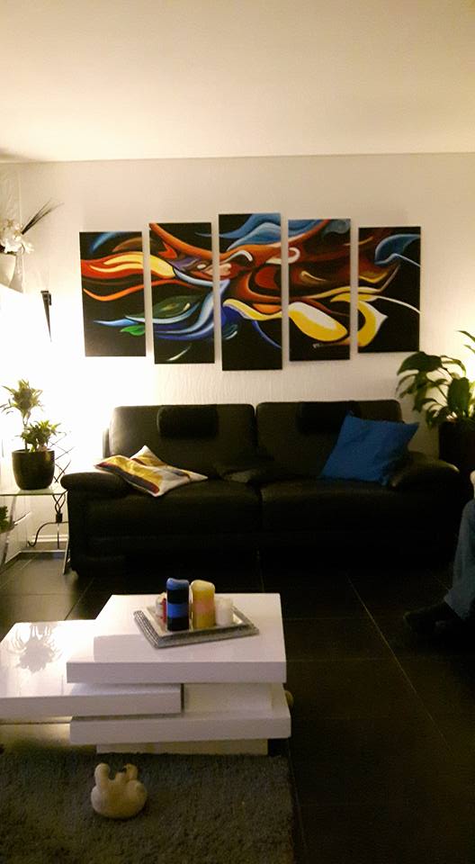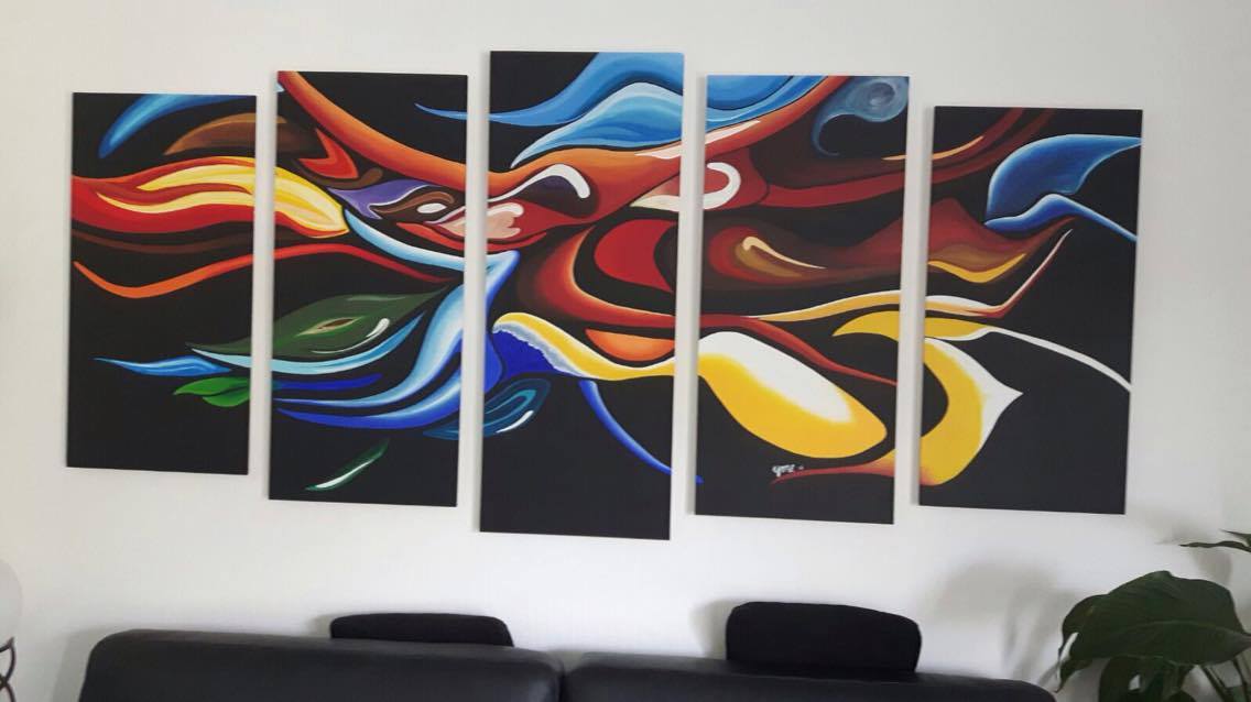 Acryl vijfluik schilderij YML ‘Elements’, 21-12-2016, in opdracht gemaakt en verkocht.