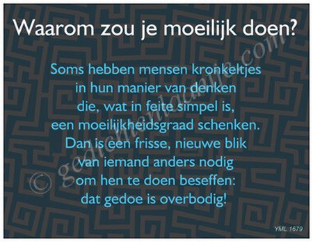 Gedichtkaart YML 1679: Waarom zou je moeilijk doen?