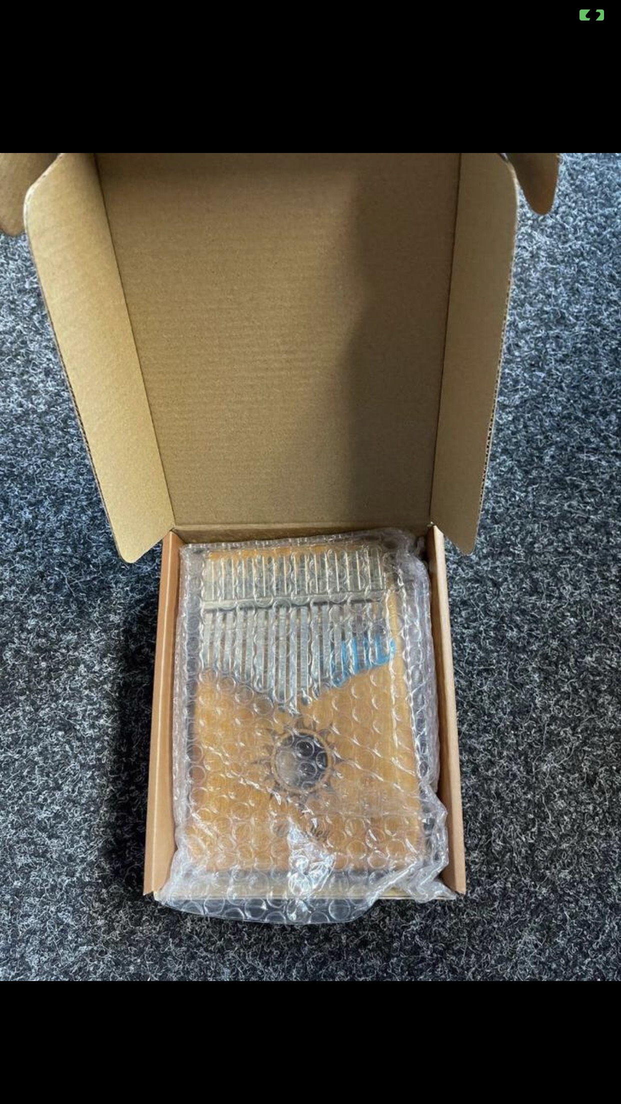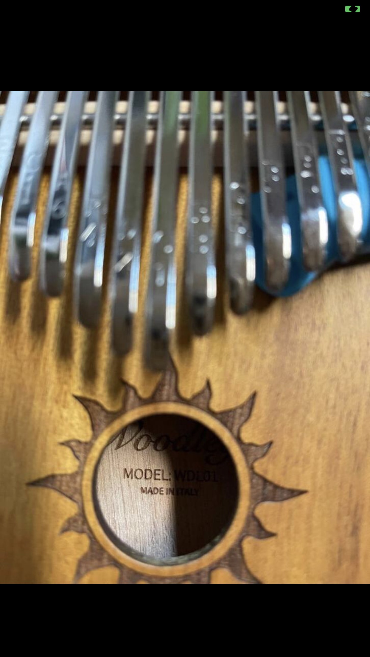 Mooie houten kalimba met 17 metalen toetsen (K17), open klankkast en sierlijke gravure rond het klankgat.
