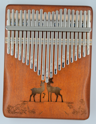 Mooie houten kalimba, roodbruin, met open klankkast en uitsnede ’twee herten’ als klankgat.