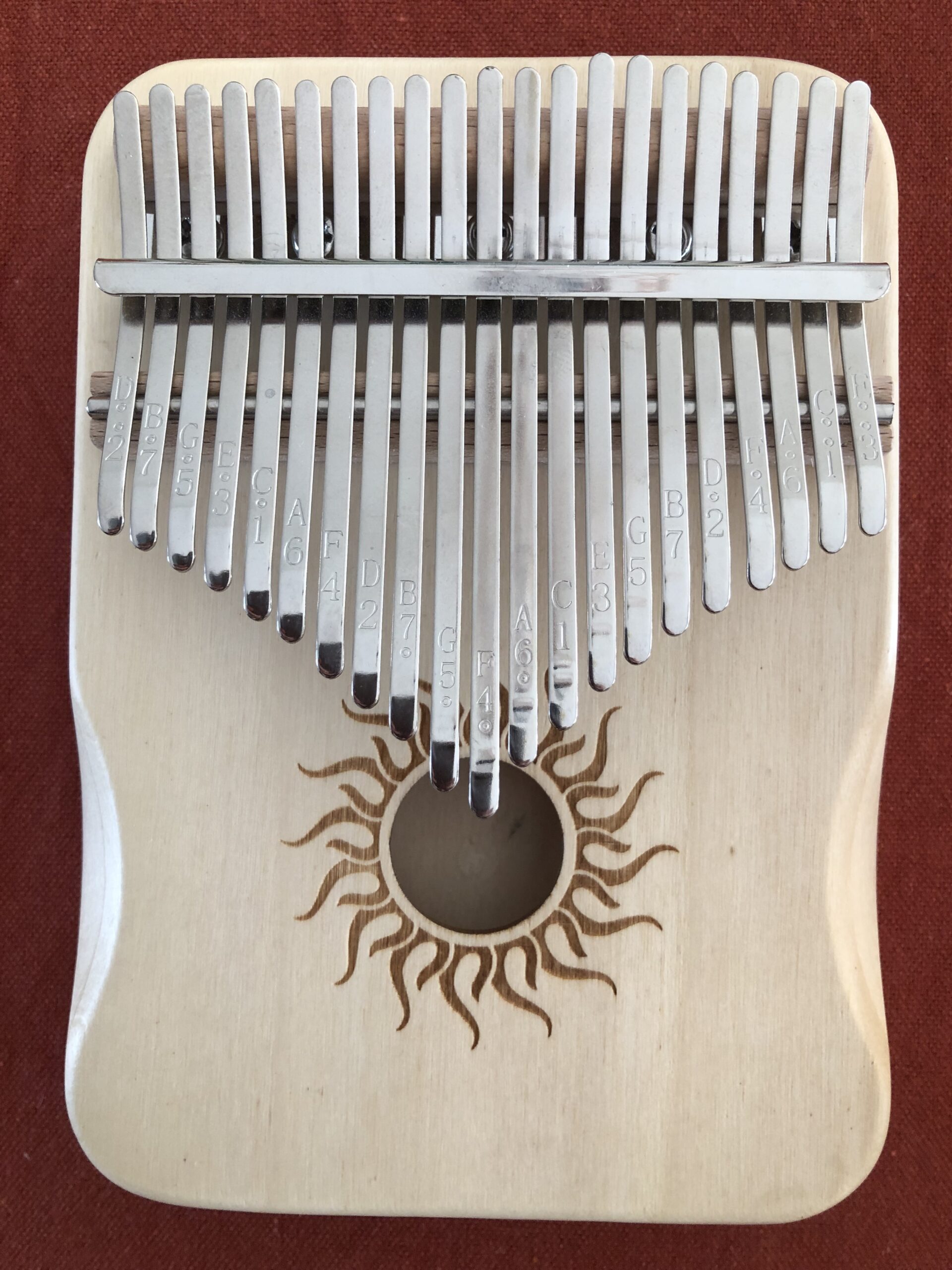 Mooie kalimba met 21 toetsen (dus vier extra lage tonen in het midden) en open klankkast.