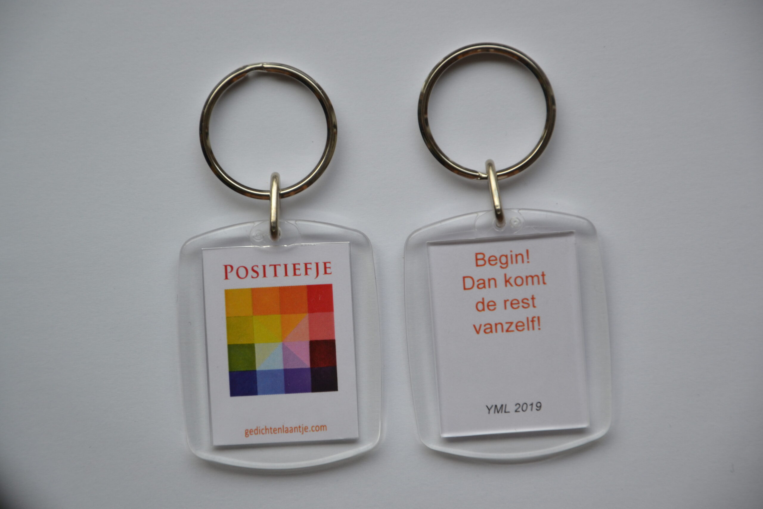 Positiefje sleutelhanger met een tekst uit het boek ‘Positiefjes 2’ van auteur Yvonne van der Laan.